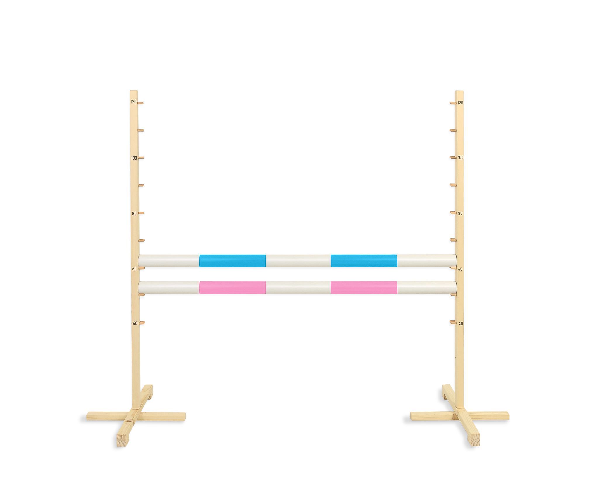 Das Hindernis ist haltbar und sicher, aus perfekt geschliffenem Kiefernholz gefertigt, damit sich das Kind beim Springen oder Bewegen des Ständers nicht verletzt. Das Hindernis hat stabile Füße, um sicher zu stehen. Die Stäbe sind aus Kunststoff, leicht und in mehreren Farbvarianten erhältlich.
