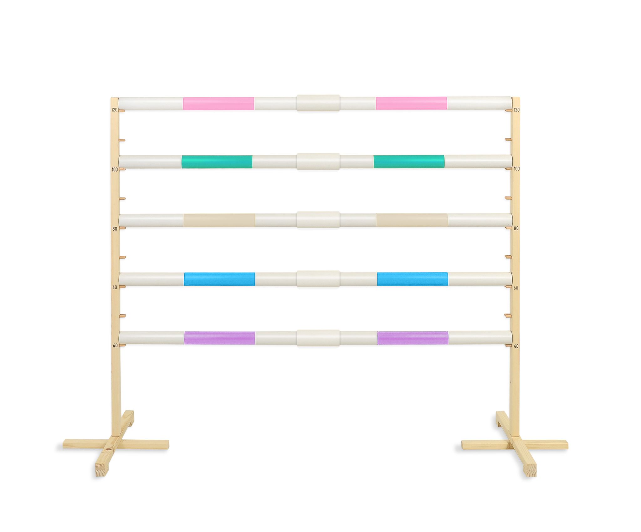 Das Hindernis ist haltbar und sicher, aus perfekt geschliffenem Kiefernholz gefertigt, damit sich das Kind beim Springen oder Bewegen des Ständers nicht verletzt. Das Hindernis hat stabile Füße, um sicher zu stehen. Die Stäbe sind aus Kunststoff, leicht und in mehreren Farbvarianten erhältlich.