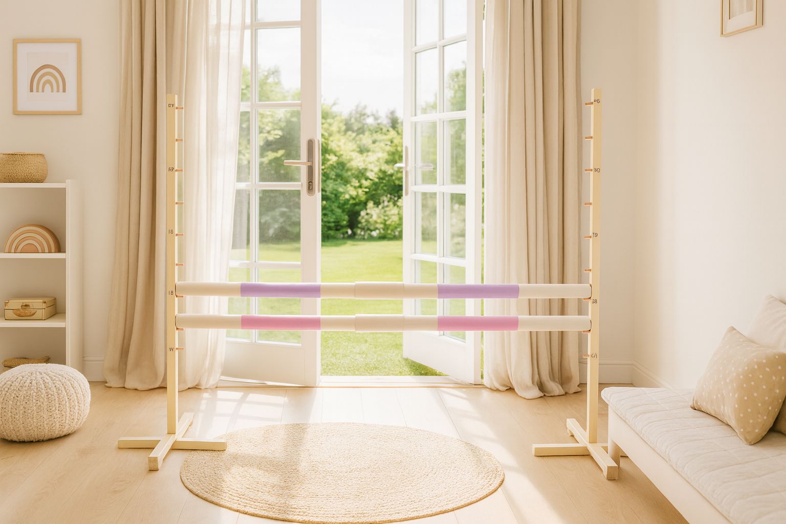 Die Hindernisstange kann auf eine Höhe zwischen 40 cm und 120 cm eingestellt werden, je nach Größe und motorischen Fähigkeiten des Kindes. Die Stange ist so konzipiert, dass sie beim Auftreffen mit dem Fuß herunterfällt.