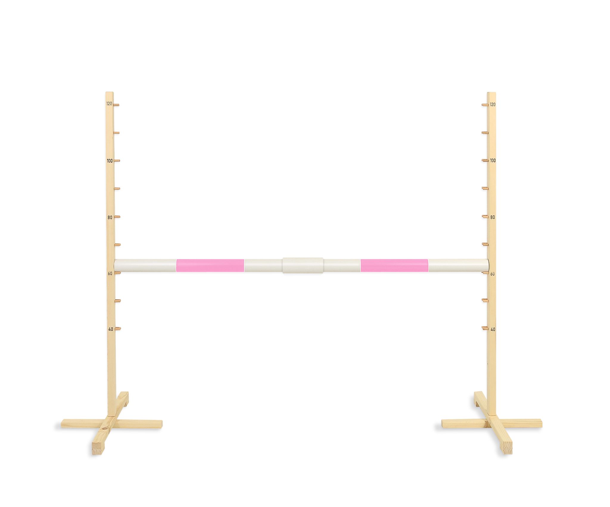 Das Hindernis ist haltbar und sicher, aus perfekt geschliffenem Kiefernholz gefertigt, damit sich das Kind beim Springen oder Bewegen des Ständers nicht verletzt. Das Hindernis hat stabile Füße, um sicher zu stehen. Die Stäbe sind aus Kunststoff, leicht und in mehreren Farbvarianten erhältlich.